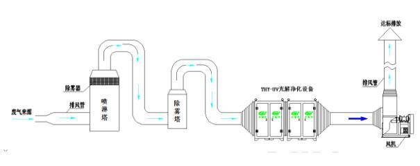 橡膠廢氣處理需要考慮運(yùn)營成本及安全性,方案工藝路線擬采用以“通風(fēng)系統(tǒng)(風(fēng)機(jī)、收集罩、管道)+預(yù)處理系統(tǒng)(凈化塔+除霧器)+核心凈化系統(tǒng)(UV光解凈化設(shè)備)”為核心工藝來處理該橡膠廢氣。橡膠廢氣處理工藝流程圖如下